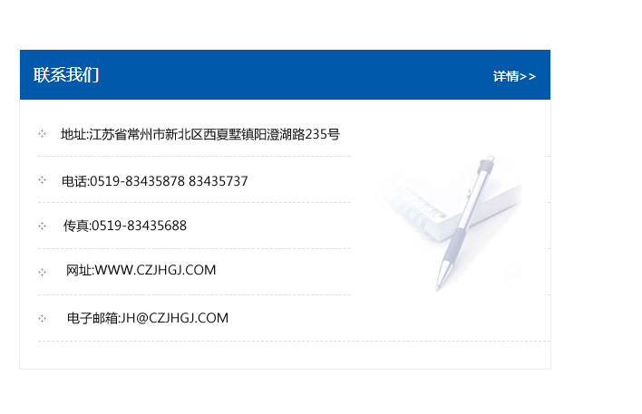 地址:常州市新北區友邦商務大廈1幢16、17層  電話:0519-85101652  傳真:0519-85112595  郵編:213022  網址:www.cz-jiayue_cn.pupuhong8.com  郵箱:xiajifengaa@163.com